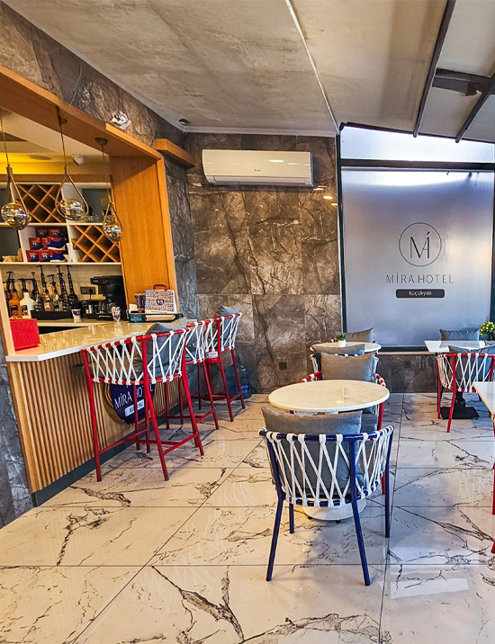 Modern ve ferah tasarımıyla Mira Bar, günün her anında keyifli bir mola vermeniz için ideal bir mekan. Menümüzde, her damak zevkine uygun lezzetli atıştırmalıklar ve zengin içecek seçenekleri bulabilirsiniz. Misafirlerimiz, burada hem dinlenip hem de sosyalleşmenin tadını çıkarabilir.
