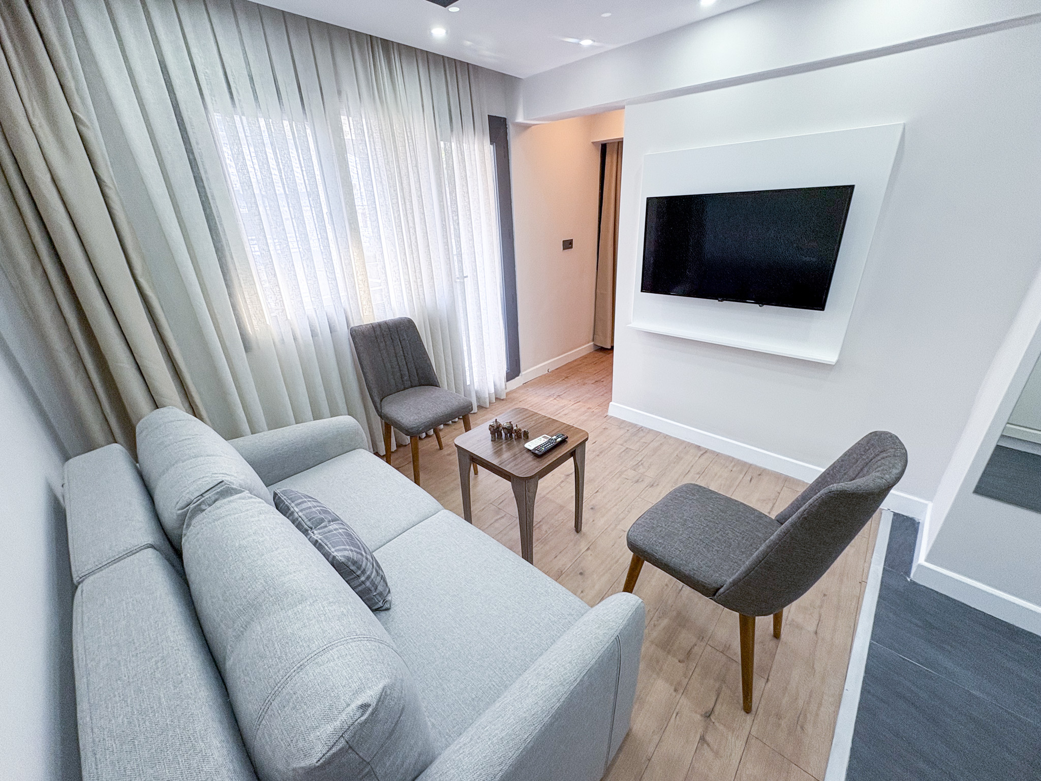 Ferah ve özenle tasarlanmış aile odası, konfor ve işlevselliği bir arada sunuyor. Modern dekorasyon detaylarıyla donatılmış yaşam alanı, geniş balkonuyla keyifli ve huzurlu bir konaklama deneyimi sağlıyor. Kahve makinesi, şık ikram köşesi ve TV gibi özenle seçilmiş ayrıcalıklar, her anınızı unutulmaz kılmak için düşünülmüştür. Hem tatil hem iş amaçlı konaklamalarda aileler için ideal bir tercih.